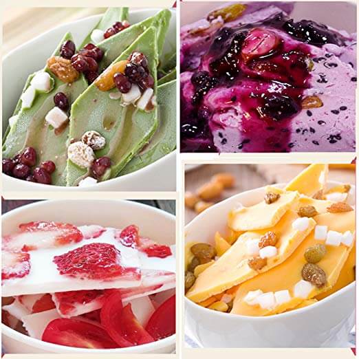 Steg 3: Ta bort plattan från kylskåpet och placera den på en stabil och horisontell bordsskiva. Häll den flytande glassblandningen på den underkylda glassplattan och tillsätt frukt, choklad, nötter, kakor eller godis för att dekorera. Fortsätt röra om och skrapa glassblandningen med de medföljande handverktygen.