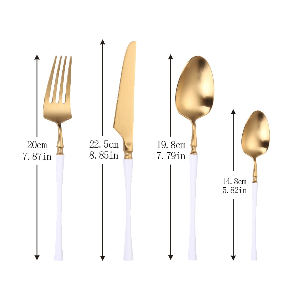 HÅLLBAR OCH SÄKER: Guldbestickset är diskmaskinssäkert, även lätt att handtvätta. Njut av en långvarig servisuppsättning som är noggrant utformad för att hålla i många års användning.