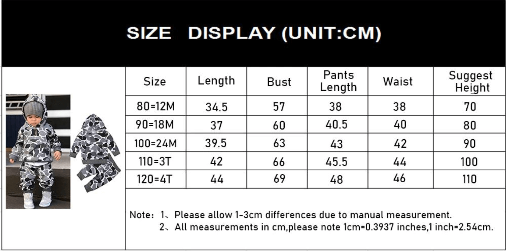 DESIGN: Snygga patchwork-ärmar med klassiska bokstavstryck. Mjukt och lätt texturerat tyg för spädbarn. Ett bra val för leksaker. Den unika kamouflagedesignen får din lilla pojke att se moderiktig ut. Långärmade hoodies kan ge ditt barn den bästa värmen på vintern. Camouflagetrycket på byxorna gör din lilla pojke till den coolaste på festen.