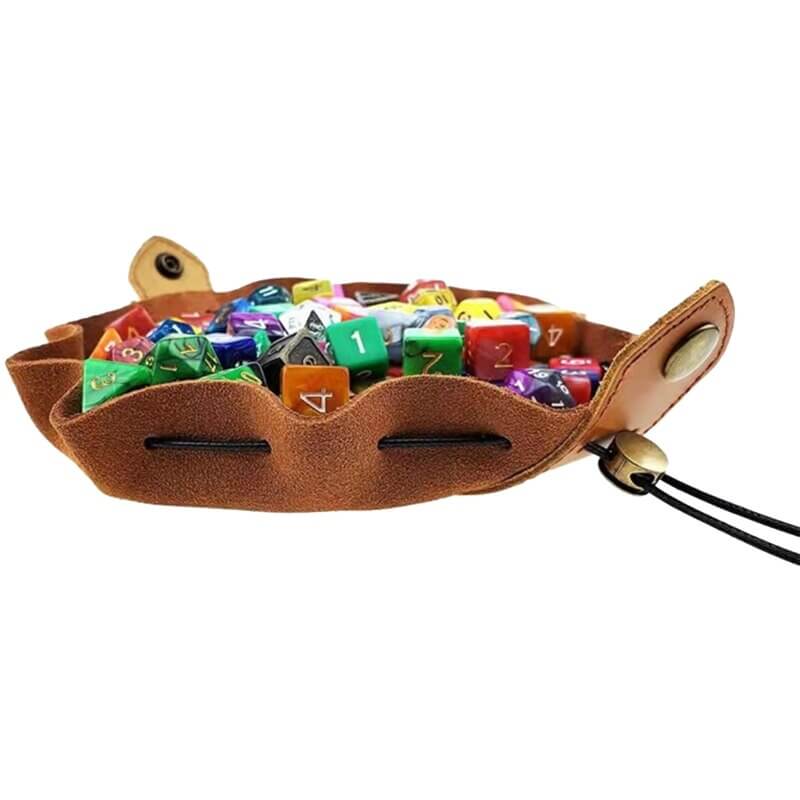 Den här handgjorda tärningsväskan i läder kommer att bli din favoritplats för att förvara dina tärningar i stan eller vid spelbordet. Den har en högkvalitativ läderpåse med en fäst karbinhaköppning, handsydd med sadelstygn som garanterar hållbarhet. Den kan fungera som en visningsbricka eller en bärväska och har en unik vintagestil som kan lyfta ditt utrymme eller ditt utseende oavsett hur du använder den.