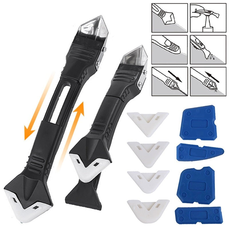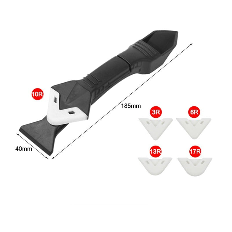 5-i-1 verktyg för tätning: Utformad för att antingen applicera eller avlägsna fogmassa. Kan användas som en silikonspackel, en skonsam skrapa för rester eller ett vasst blad.