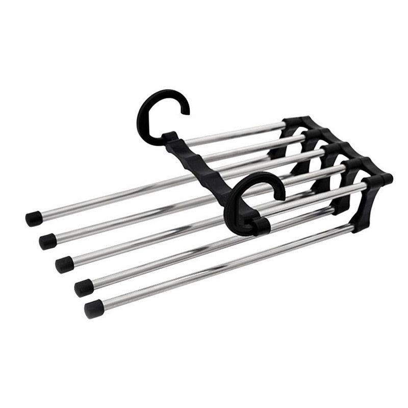 Den multifunktionella byxhyllan håller dina byxor rena och snygga och sparar mer utrymme. Det finns två krokar på toppen. Du kan använda två krokar för horisontell upphängning eller bara använda krokar för vertikal upphängning. Fem rör av rostfritt stål används, som var och en kan dras utåt för enkel upphängning och återvinning. Den är perfekt för resor eller affärsresor och kan även användas som torkställning.