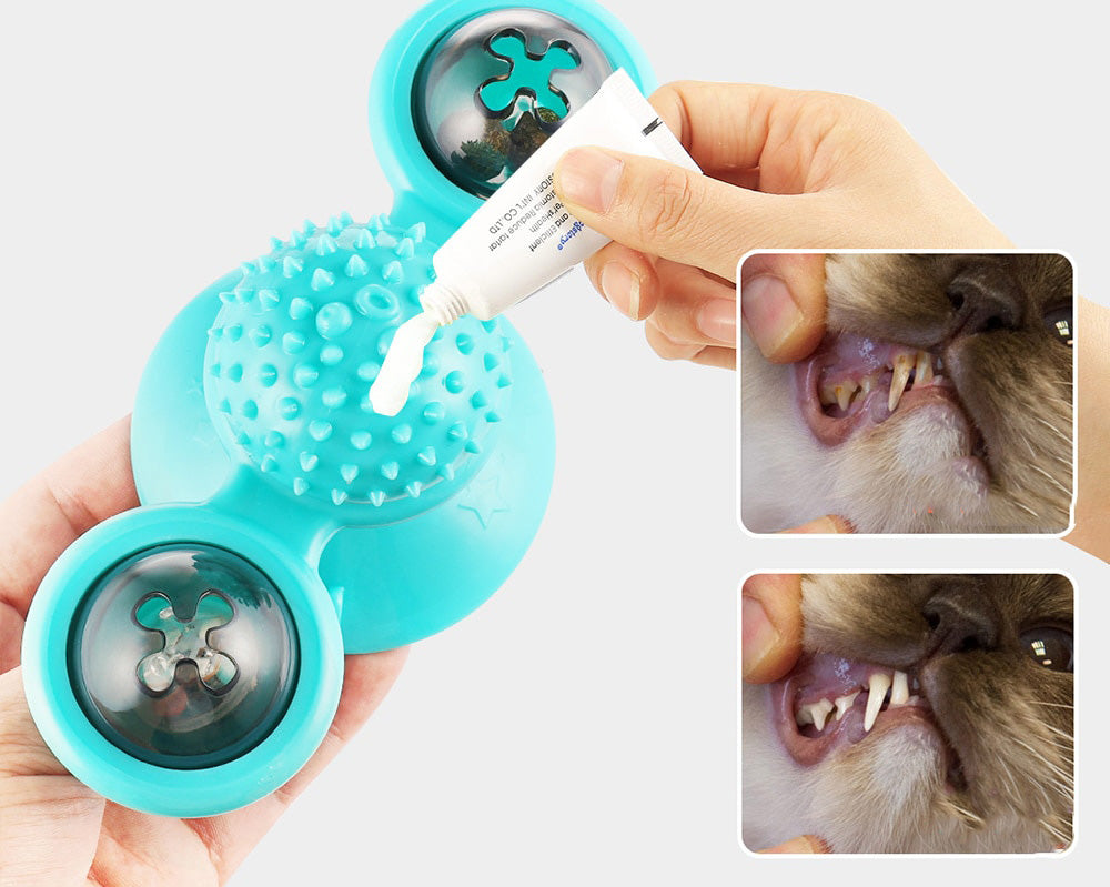 Leksak med flera funktioner: Det är inte bara en borste för kattvård utan också en roterande vindkraftsleksak för katter. Katterna kan använda den mjuka mittendelen för att klia sig i ansiktet eller borsta tänderna, och det finns två genomskinliga hål på vindkraftverkets blad med kattmynta och en glödande boll inuti för att locka katterna. Katterna kan rotera vindkraftsleksaken för att få självunderhållning.