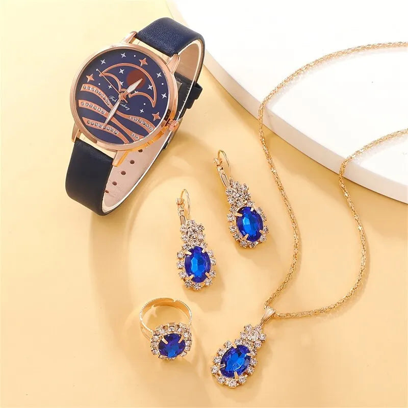 Tillverkad med precision säkerställer klockans kvartsrörelse inte bara stil utan också noggrann tidsmätning. Den sömlösa integrationen av ädelstenar med betraktaren skapar en harmonisk och hisnande syn, vilket gör denna uppsättning till ett verkligt konstverk.