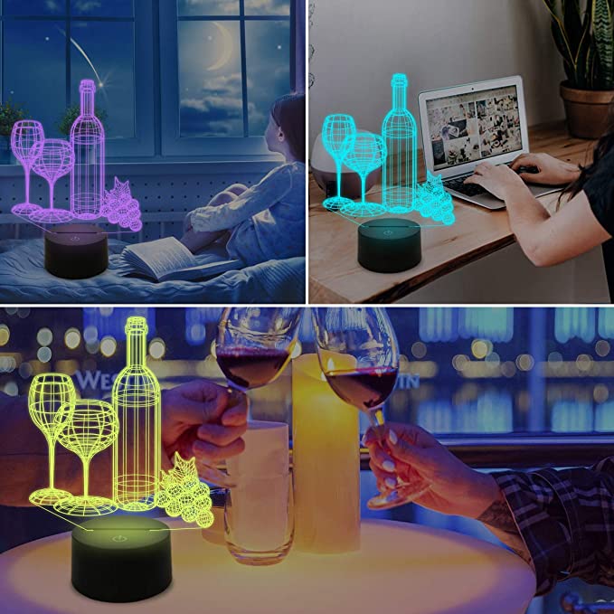 Wine and Glass 3D Illusion Light är en kombination av konst och teknik som skapar en optisk 3D-illusion. Du ser designen på långt håll men en tunn akrylglasskiva som är helt platt när du kommer nära. Den har växlande färger till totalt sju färger, den kommer garanterat att blända och imponera på dina gäster samtidigt som den alltid lyser upp rummet och dina liv.
