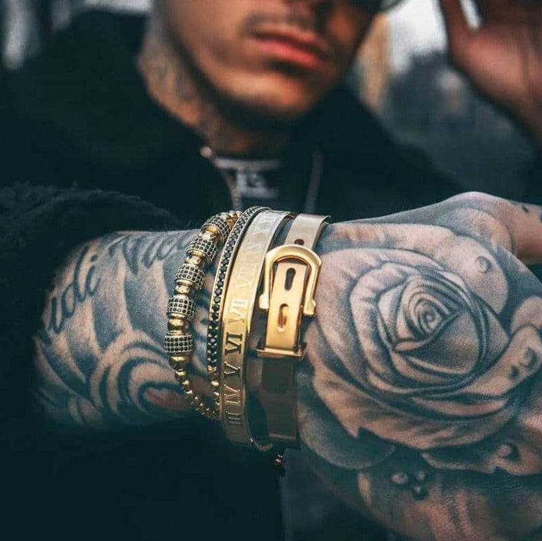 Känn dig som en kunglighet i den här trendiga armbandet, för män med stil. Setet med 4 delar innehåller en guldmanschett med etsade romerska siffror, ett massivt band med svarta zirkoner och två charmarmband med zirkoner. Den krönande glansen är statement-kroncharmén, en symbol för ära.