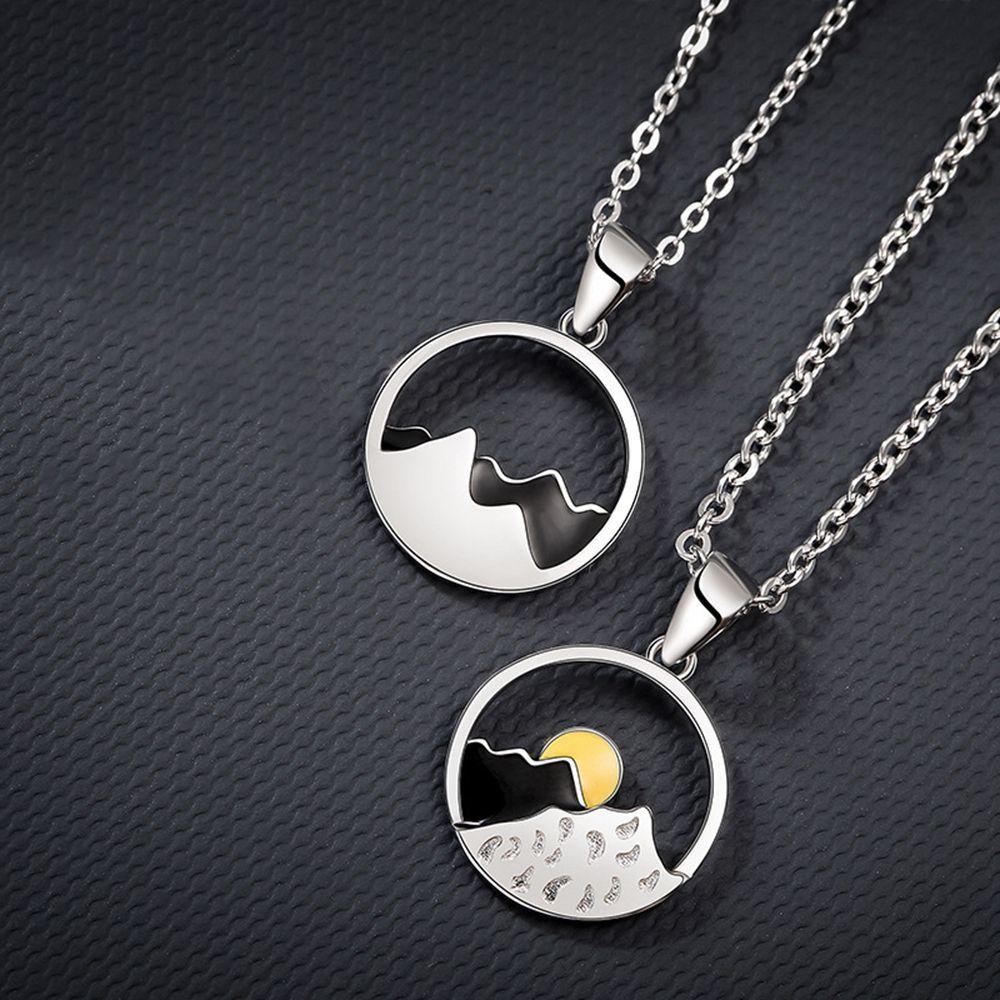 EXKLUSIV DESIGN: Det här halsbandet med berg och havsvågor har lager av silver som visar berg och havsvågor med solen som tittar bakom dem för att skildra soluppgången och solnedgången. Charmen har en bergskedja med hamrad finish, oxiderade detaljer och en liten bronsfärgad sol i fjärran.