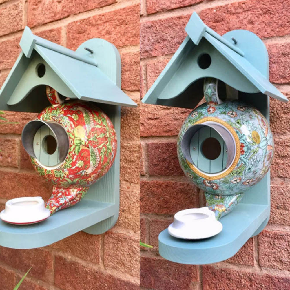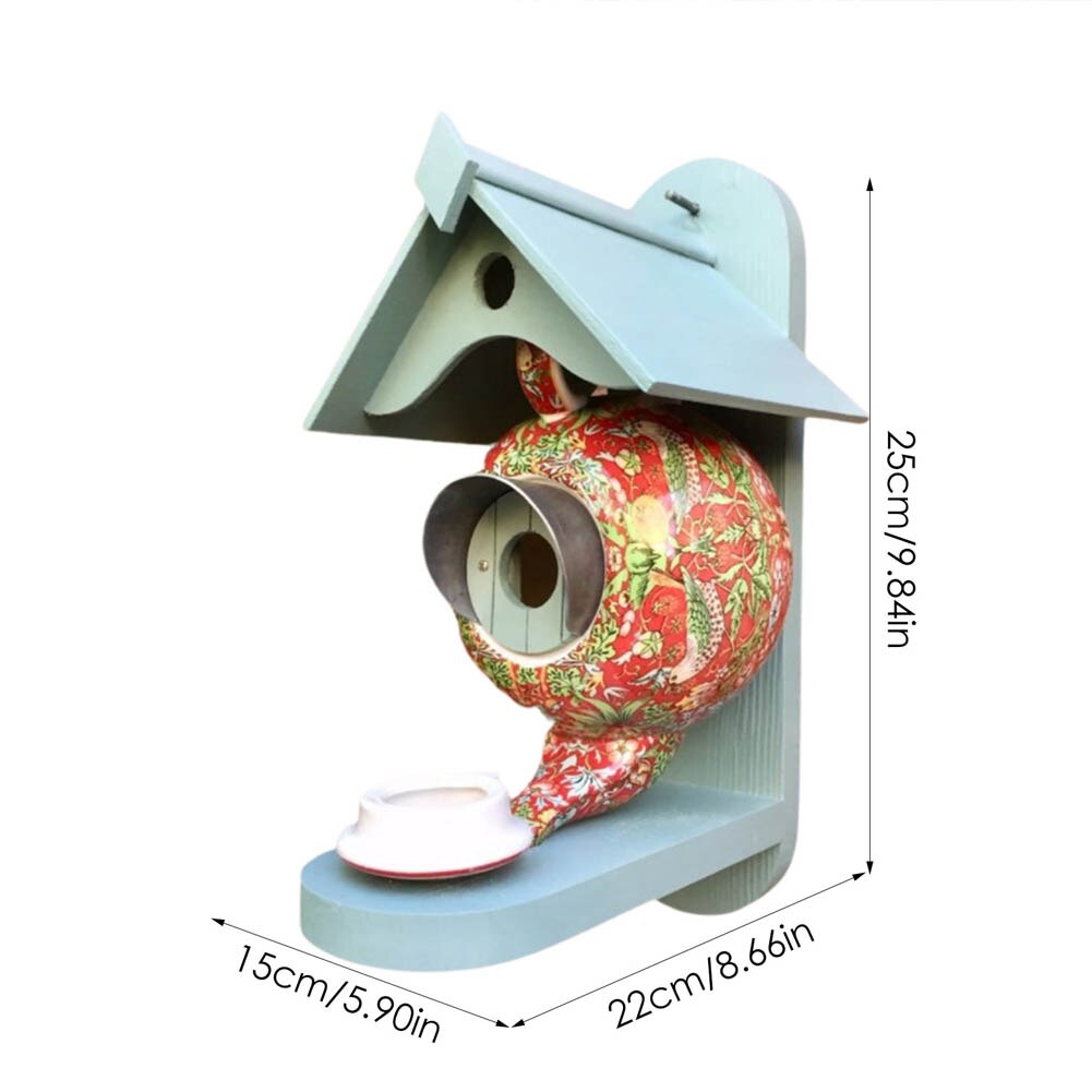 Lyft din utomhusmiljö med denna unika trädgårdsdekoration. Häng den under takfot, på trädgrenar eller vid din uteplats för att skapa en lugn oas för fjäderklädda vänner. Med en enkel installation på en träram, komplett med munstyckshål och en tekannlock som fungerar som matningsskål smälter detta fågelhus sömlöst in i din omgivning.