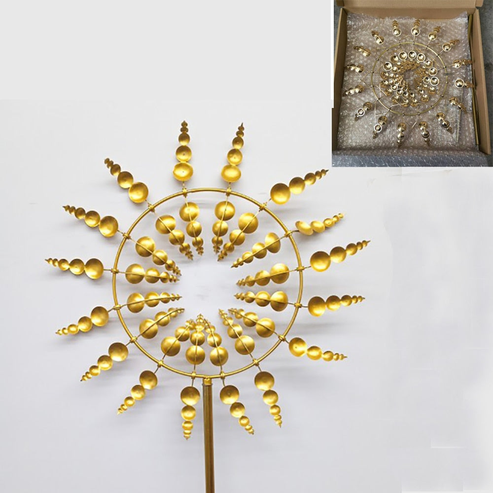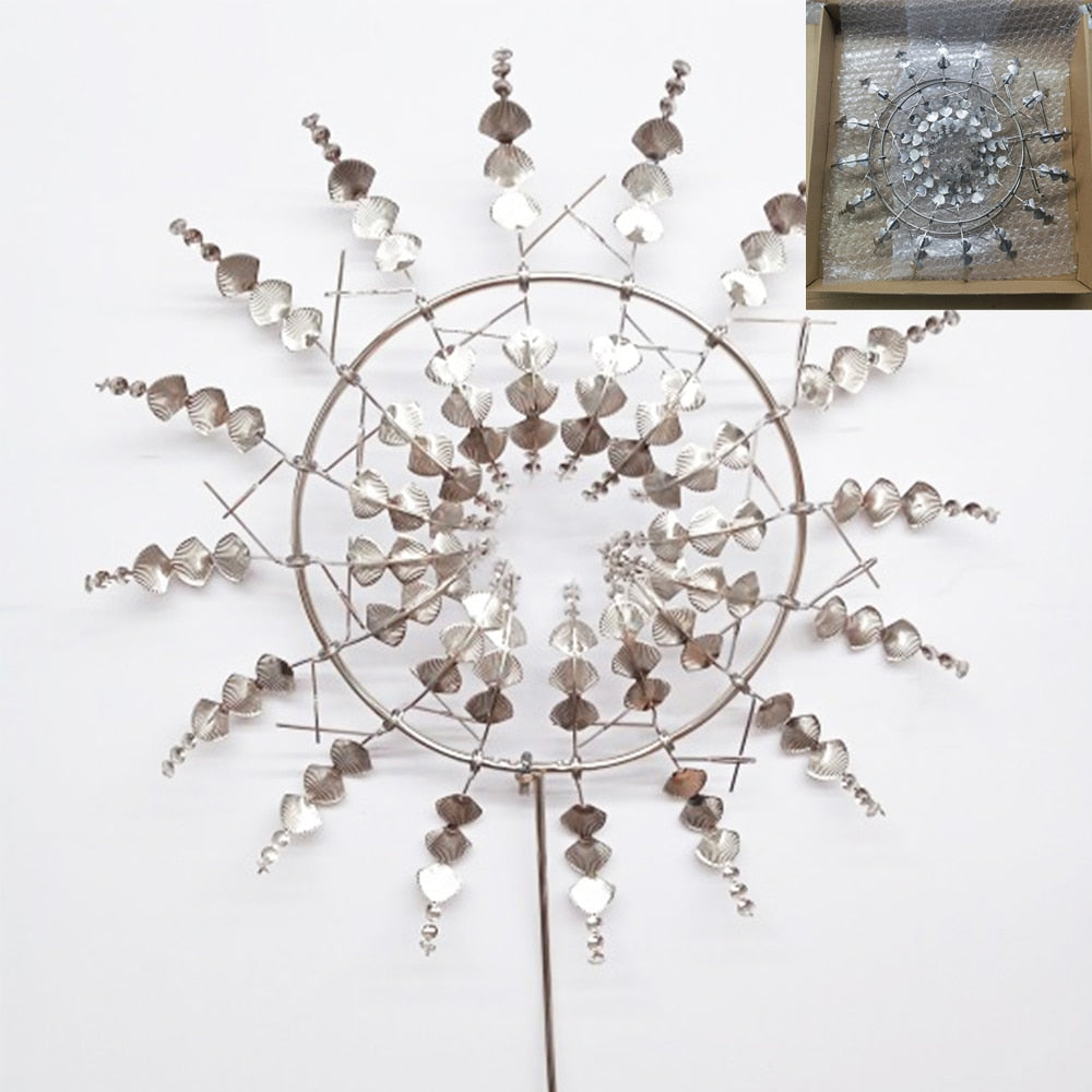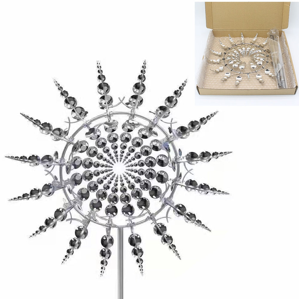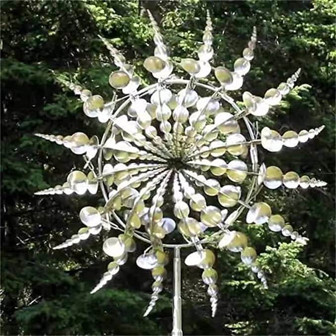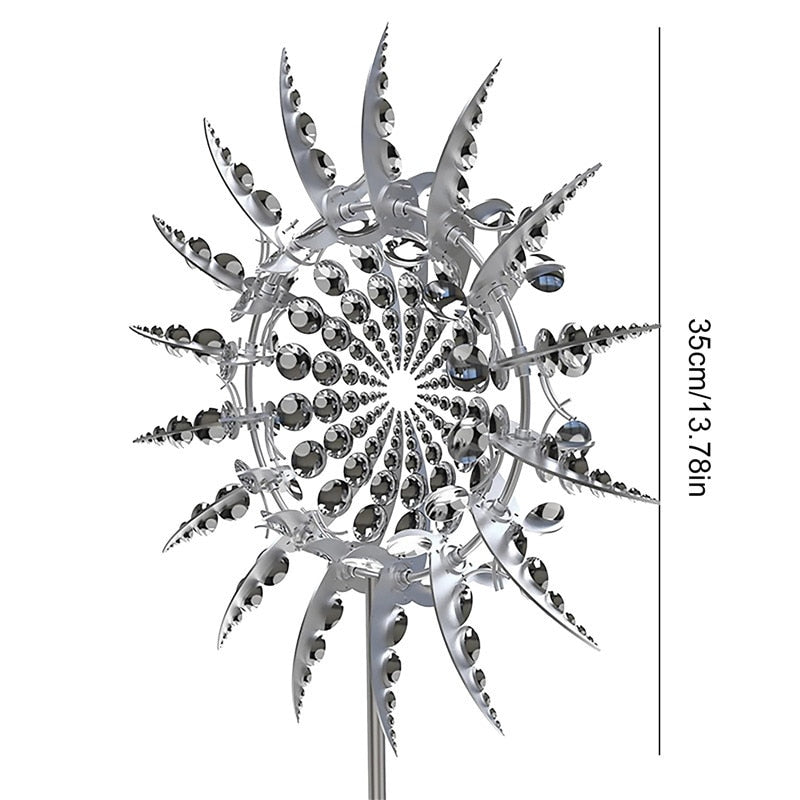 Varje blad i denna väderkvarn är konstruerat för att snurra i olika riktningar och skapa underbara och konstliknande former. Den kullagerförsedda konstruktionen gör att vår väderkvarn snurrar tyst även i den minsta brisen. Väderkvarnen i metall gnistrar i solen och du kan njuta av din trädgårdsprydnad.