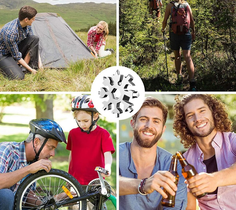 • STILIGA ACCESSOARER: Med en distinkt snöflinga-formad design kombinerar detta multiverktyg elegansen hos naturen med funktionella verktygselement. Det är inte bara praktiskt utan ger också en cool och stilfull touch till dina accessoarer. Den rostfria verktygslådan kan användas som en dekorativ nyckelring eller ryggsäcksaccessoar och visar sin coola faktor.
