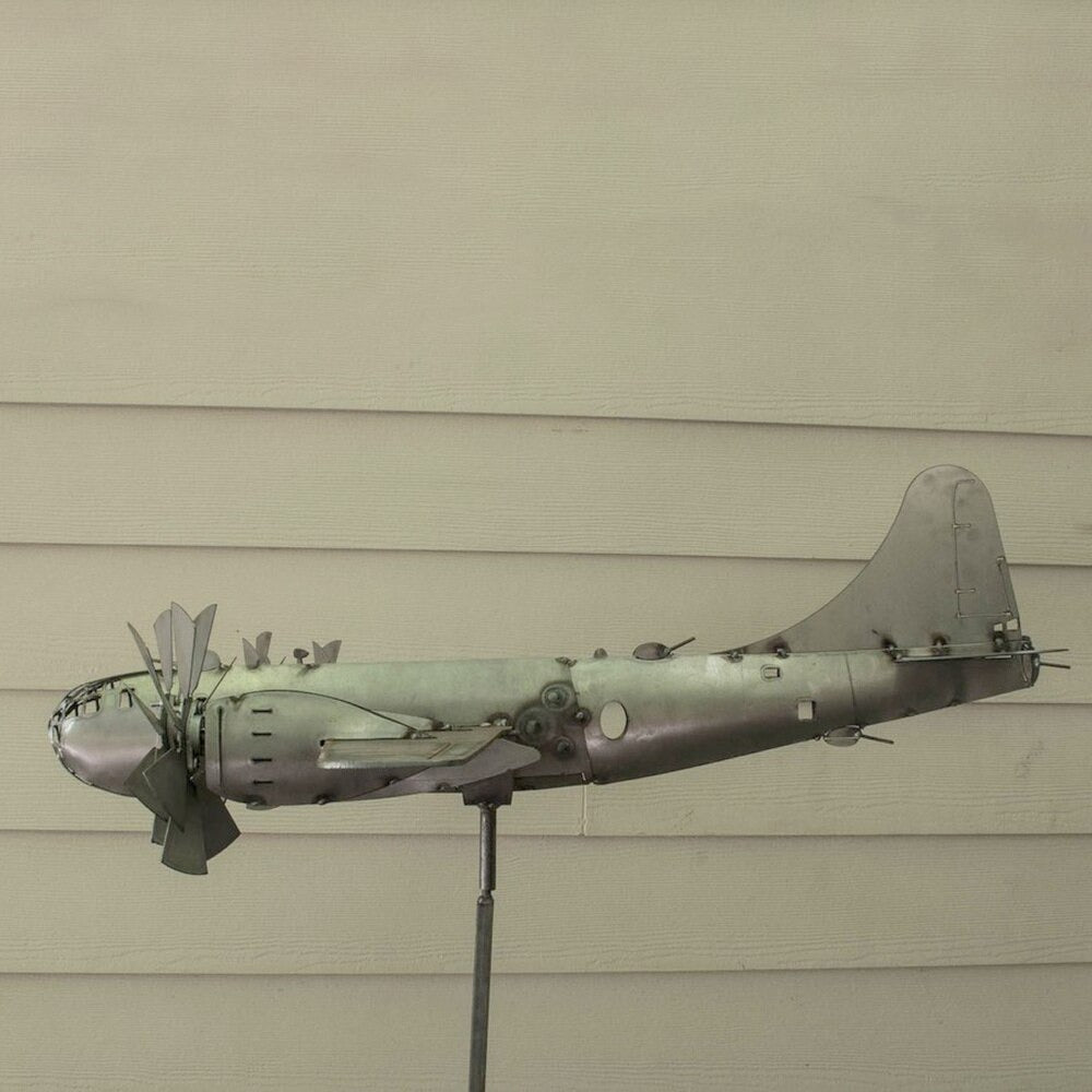 Lägg till lite flygnostalgi i din gräsmatta med den här flygplansvindkvarnen. Den är tillverkad av rostfri metall och dess hjulblad rör sig i vinden. Den här vindsnurran ger en spännande fokuspunkt för en gård eller trädgård, eller så kan du använda den som en festcentral!